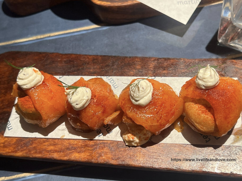 Bombas de Salmon Curado y Trufa Light profiteroles filled with rich, creamy truffle cheese and savory cured salmon. With the opulent scent of truffle, it’s a flavor explosion!