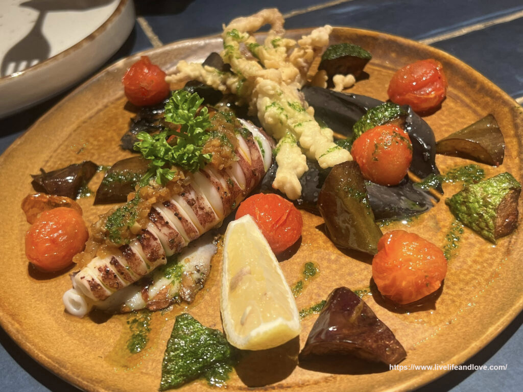 Calamari Plansa Tender grilled calamari, a dish that is simply prepared and ideal for sharing, served alongside small portions of grilled eggplant, cherry tomatoes, lemon, and more..
