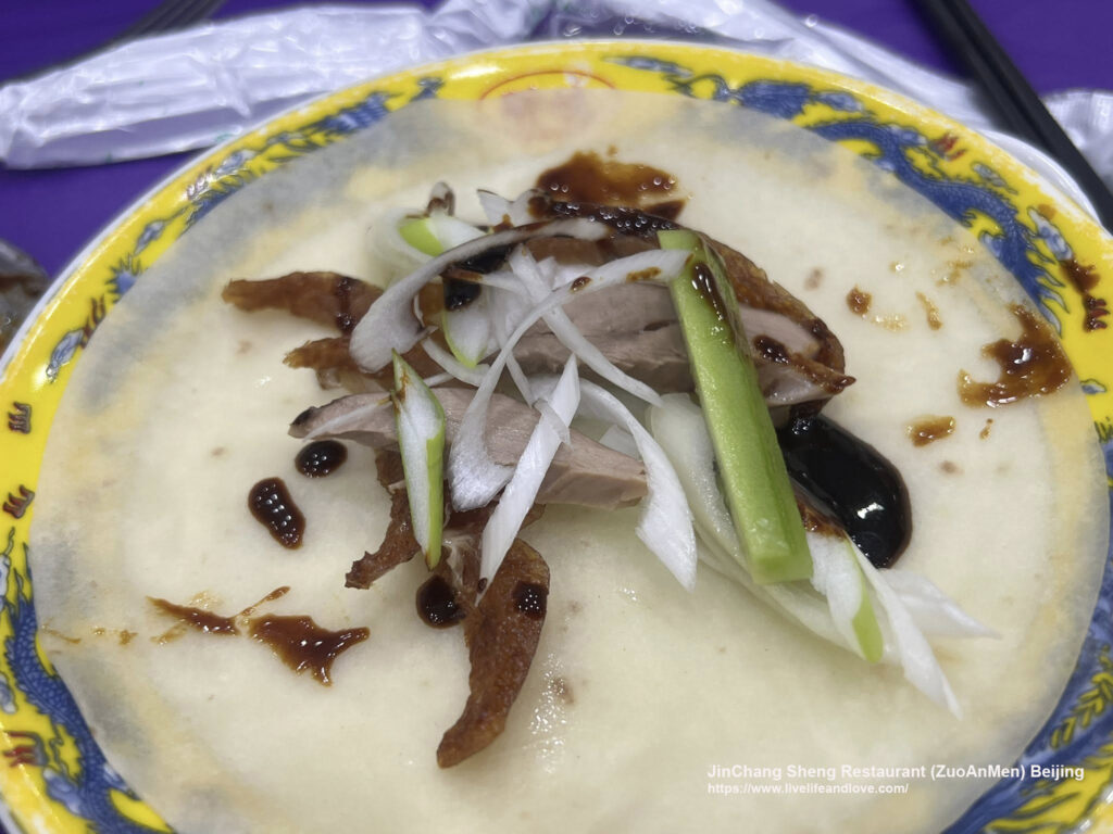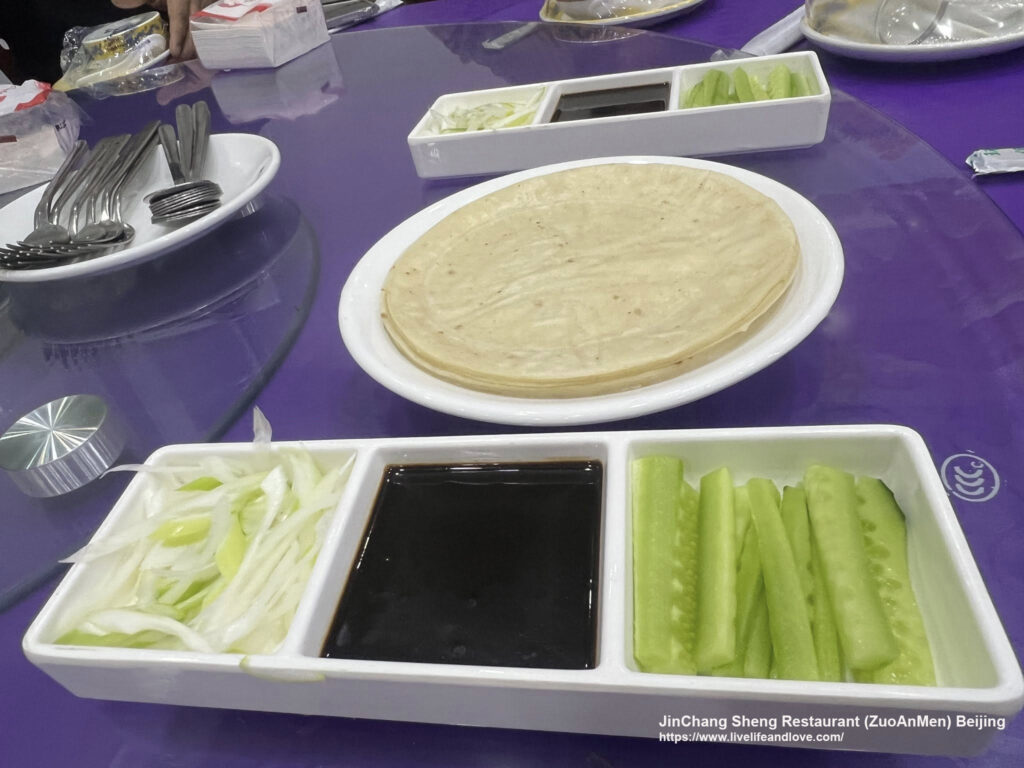 This is how it looks before wrapping. Wrapping roast duck is crucial as it helps to create the ideal bite that brings together crispy skin, tender meat, fresh scallions, cucumber, and a delicious sauce.
