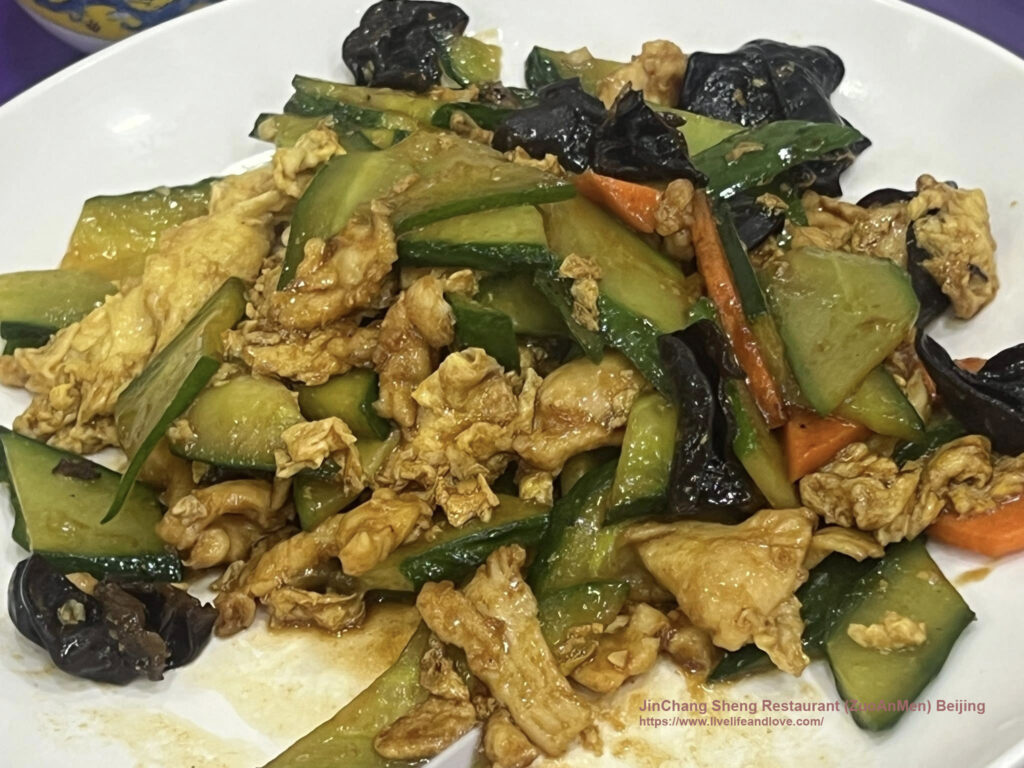 Sautéed thinly sliced chicken, cucumber, black fungus, and finely cut strips of carrots. Healthy dish prepared, it’s a Sauteed vegetables.
